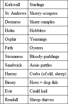 GROUP SOBRIQUETS IN ORKNEYIn the following letter, which I owe to the kindness of Mr. Duncan Robertson, we read that, in Orkney and Shetland, local sobriquets are derived from what the people are alleged to eat. The tradition is, Mr. Robertson informs me, that each group is named after the edible plant or animal which it brought when engaged in building the Cathedral of Kirkwall.
