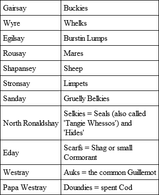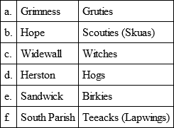 Scouties may be derived from the skua, though Mr. Heddle gives an unpresentable derivation. The word Birkies he did not know the meaning of, but asked two or three people, who all said the Sandwick people were so called 'because Sandwick was such a place for tangles coming ashore, and the people had such a habit of eating what they called "birken" tangles, i.e. the stout or lower ends of the large thick tangles.'