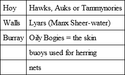 Oily Bogies. – I hardly see how this can have been 'eaters of.' There might have been some old story to the effect that the Burray men stole and ate these buoys, but I never heard it.