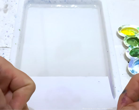 4. Отстоявшийся раствор необходимо перелить в лоток и немного подождать, чтобы он равномерно распределился. Высота водного раствора в емкости должна составлять примерно 2 см. Чтобы собрать микро-пузырьки воздуха с водного раствора, положите на его поверхность лист бумаги для эбру-рисования на 2—3 минуты. Затем держа лист за края, снимите его «на себя» через бортик лотка.