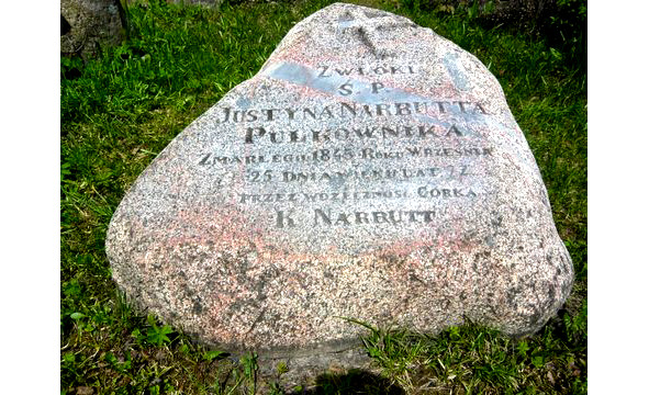 «ПАРЭШТКІ / С. П. / ЮСТЫНА НАРБУТА / ПАЛКОЎНІКА / ПАМЁР У ВЕРАСНІ 1845 г. / 25-ГА ДНЯ ВА ЎЗРОСЦЕ 72-ГАДЫ / АД УДЗЯЧНАЙ ДАЧКІ / К. НАРБУТ //.»14. Адрас пахавання, Старыя Росы, сектар – 12, нумар магілы – 0038.