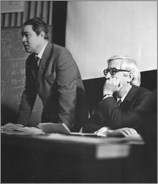 Г.М.Идлис выступает с докладом на Зеленчукской школе-семинаре SETI.Справа летчик-космонавт СССР К.П.Феоктистов. Фото из архива автора