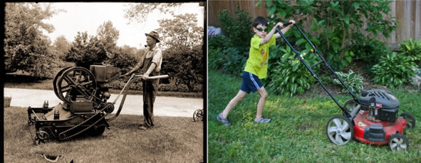 В сущности современная газонокосилка принципиально не отличается от первой бензиновой газонокосилки 1918 года полковника Эдвина Джорджа. Обычное конструкторское совершенствование всех элементов, без прорывных пионерных решений. Но, черт возьми, есть разница! Если желающих покупать первые газонокосилки было немного (дорогие, тяжелые, шумные…), то теперь почти каждый владелец дома в США имеет свою газонокосилку.