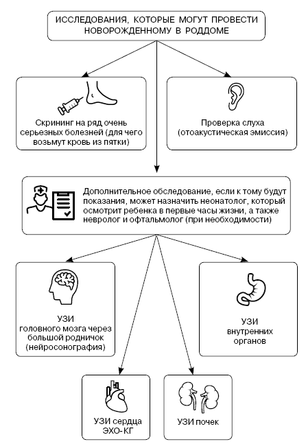После того как вас переведут в послеродовое отделение, ребенка в первые часы жизни должен осмотреть неонатолог. По результатам осмотра врач может счесть необходимым наблюдение за ребенком в условиях детского отделения или кювеза, поставить ребенку капельницу, назначить ему дополнительные лекарства или взять у него анализы.