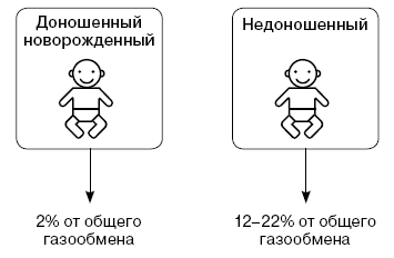 3. У зрелого новорожденного кожа «дышит»: она берет на себя 2 % от общего газообмена, а у недоношенных эти цифры в 6–11 раз больше.