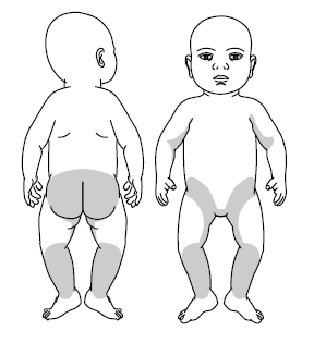 Располагается пеленочный дерматит в местах соприкосновения кожи с раздражающими факторами: в области паховых складок, гениталий, ягодиц, бедер, голеней и поясницы.