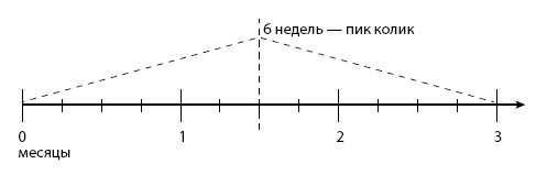 Пик колик отмечается обычно в 6 недель жизни, далее, обычно к 3 (реже 4) месяцам жизни, они проходят по мере установления лактации, нормализации микрофлоры кишечника и созревания ферментной и моторной активности кишечника.