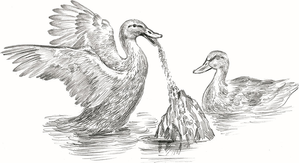 Особенно интересен один из самых распространенных космогонических сюжетов – история о создании суши из кусочка земли, принесенного существом-ныряльщиком. Данный сюжет встречается у многих народов Северной Евразии и даже Северной Америки. В изначально водном мире, где не было ни земли, ни людей, только воды и водные существа, однажды водоплавающая птица, будь то утка или лебедь, либо животное, например черепаха, решает нырнуть в глубины вод, чтобы достать комочек земли. Этот комочек постепенно разрастается и становится сушей, местом, где начинается жизнь.