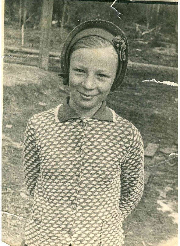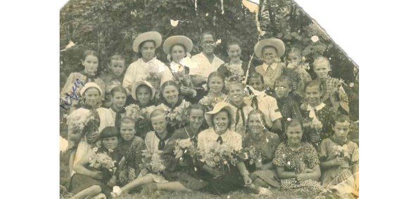 Мама во втором ряду первая слева, в белой панамке и с букетиком цветов. Рядом написано: «Тома». Лагерь «Весёлый бор» 1952 год. На обороте: «На память Неле от Верхорубовой Люды. Здесь нет особой красоты, она не каждому даётся. Здесь простая душа, и сердце простое в ней бьется», г. Серов, с\п, 14 линия, барак 40—8»