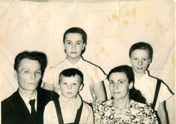 Семья Петуховых. Фотография сделана без дочери Векшиной Нэлли (она уехала учиться в Нижний Тагил в педагогическое училище). Этот портрет висел в раме, в большой светлой комнате над диваном в с. Андрюшино. Слева в первом ряду Петухов Александр Фёдорович, Петухов Николай Александрович, Петухова Екатерина Фёдоровна. Слева сзади Векшина Галина Александровна (в браке Иванчик), Петухова Тамара Александровна (в браке Городилова).