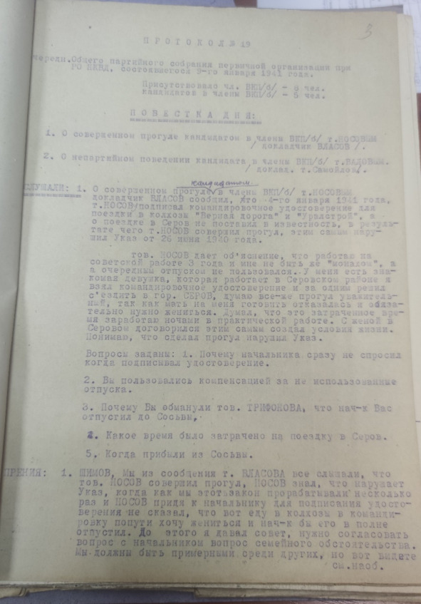 «Докладчик тов. Трифонов привел цифры выполнения расчета и указал, что ряд членов партии не сдали тёплых вещей, несмотря на все возможности, например, тов. Коркунов, Кузеванов, Муравьев, Батенев А., а тов. Лобанов ввёл в заблуждение, а вернее обманул бюро РК ВКП (б) при приёме в партию.