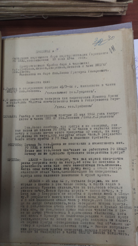 Вот, что зафиксировал документ: «Тов. Носов сообщил, что прогул я не совершал, так как вышел из здания РО НКВД в 12 часов и захватил спец. почту, и только из-за этого просрочил 40 минут, да жену устраивал на катер, тут затратил около часа. В результате всего этого прибыл в РО НКВД в половине третьего».