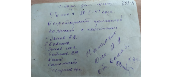 Оборот: Слева направо: Зыков Александр С., Савельев, Зыков М. К., Батенёв П. М., Калин, Калюжный, Пестриков Аркадий