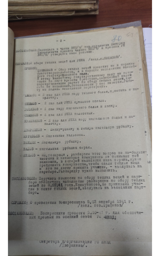 На вопрос о сдаче им тёплых вещей ответил, что у него есть только одна шуба, тогда как имеет два полушубка, один тулуп, одно тёплое пальто и другие. Надо всем коллективом довести до сознания этих товарищей всю важность сбора тёплых вещей для героических бойцов РККА».10