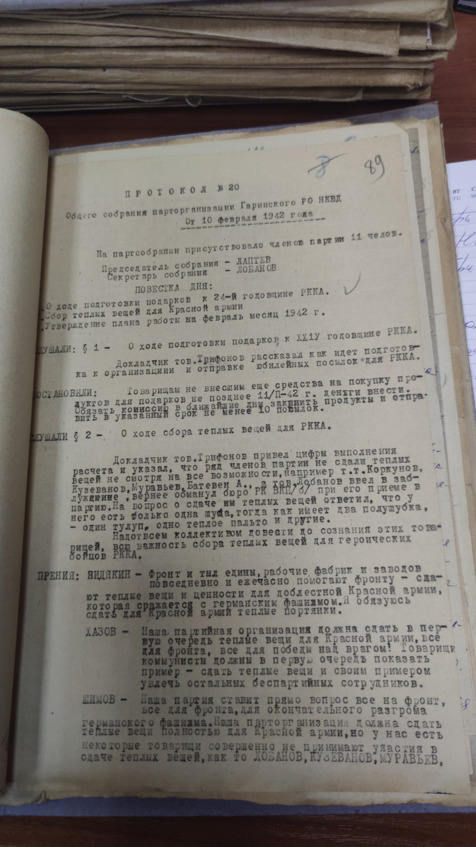 Протоколом от 04 октября 1941 года №11 общего партсобрания при Гаринском РО НКВД на котором присутствовало 15 человек решено провести сбор тёплых вещей для РККА