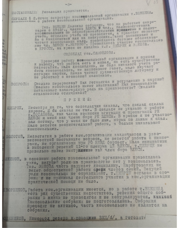 Протокол сообщает нам, что он выступил с докладом, рассказал, что является «секретарём комсомольской организации с 1941 года, членов ВЛКСМ – 7, политподготовка комсомольцев по общеобразовательным предметам и политучёба, отдельно учёба не проводится, а проводится вместе с кандидатами или на дискуссиях. Газет выписывают и читают комсомольцы мало. Проводилось бытовое обследование члена ВЛКСМ т. Зыковой, Провдилось участие в кроссе, на кросс не явились т. т. Зыкова и Щибрик».