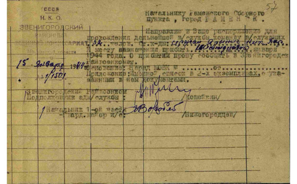 Начальнику Раменского сборного пункта город Раменск, «Направляю в Ваше распоряжение для дальнейшего прохождения в/службы команду в/служащих из 32 человек. Ст. команды: Ядынин Ник. Пар. (неразборчиво). К месту назначения прибыть 16 января 1944 года. О прибытии прошу сообщить в Звенигородский райвоенкомат. Основание: наряд МОБК….№ от… Приложение: именной список с указанными в них документами. Подпись – Звенигородский райвоенком подполковник адм/службы Копейкин, начальник 1-ой части гвардии майор и/с Нижегородцев. СССР, НКО, Звенигородский районный военный комиссариат Московской области 15 января 1944 года №1/1501