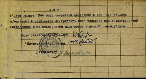 15 января 1944 года составлен настоящий акт о том, что команда военнослужащих в количестве 32 (тридцать два) человека при Звенигородской райбольнице была подвергнута медосмотру и полной санобработке. Подпись – врач Звенигородской больницы, начальник 1 части (Воробей подпись неразборчиво), дезинфектор (тоже похоже Воробей или Воробьев)14