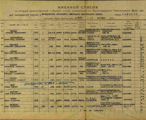 Именной список на младший начальствующий и рядовой состав, направленный из Звенигородского Райвоенкомата Московской области для прохождения службы в распоряжение начальника Раменского пересыльного пункта, г. Раменск (основание наряд Облвоенкомата №1/3657 от 12.10.1943 года.