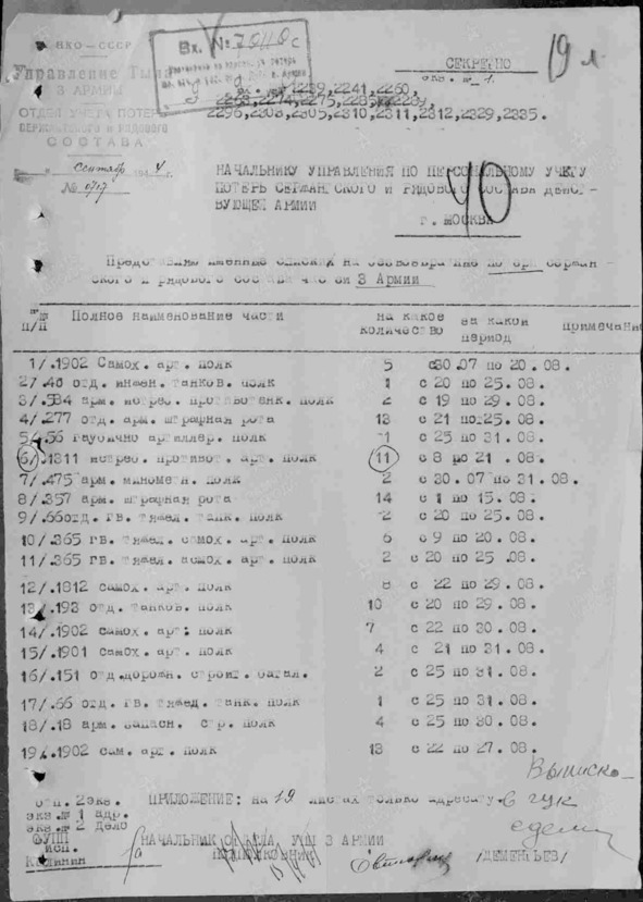Сопроводительное письмо к Списку безвозвратных потерь сержантского и рядового состава. В строке 5 – Векшин Александр Иванович, беспартийный, сержант, наводчик, убит в бою 26.08.194415