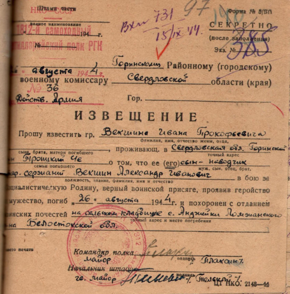 Вот такое страшное извещение получила семья Векшина Александра Ивановича о своем любимом человеке.