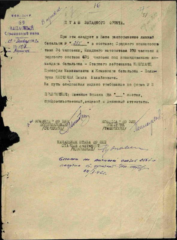 Также – на Военно-пересыльном пункте 69 злп 22 зсбр.: выбытие из воинской части: 20.01.1942, в штаб ЗапФ (Западного фронта), номер команды: 255.