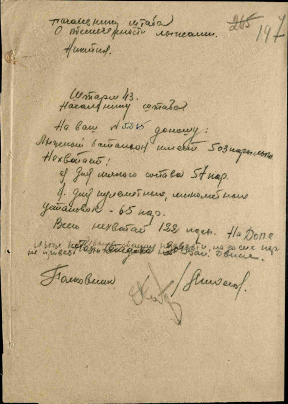 Всего не хватает 122 пары. На ДОПЕ лыж… но до сих пор не привезли. Полковник – подпись Михеев
