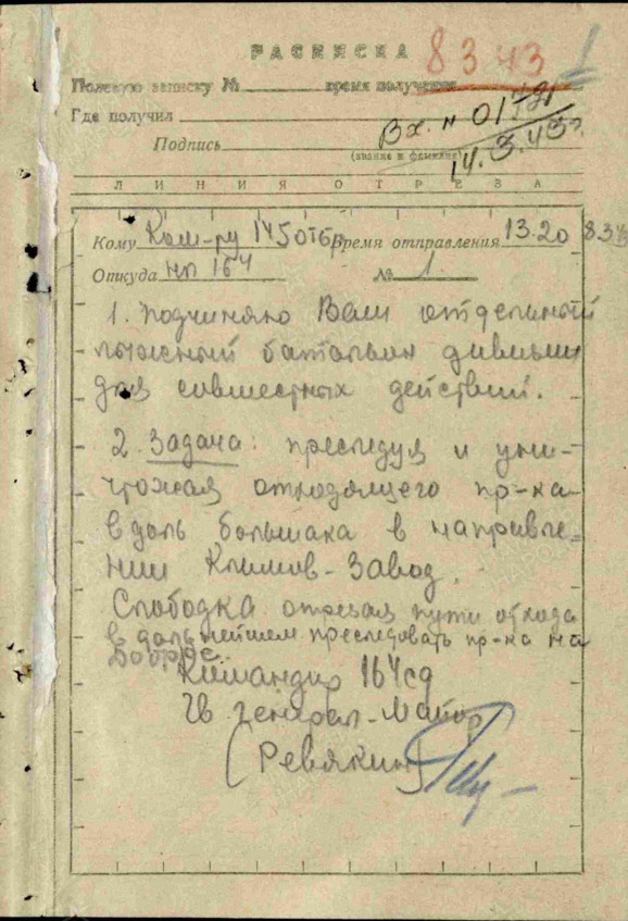 Полевая записка. Командиру 145 отр. Время отправления 13.20 08.03.1943