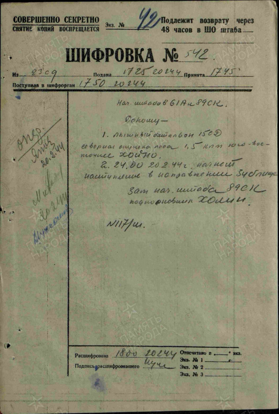Описывает период с 20.02.1944 по 20.02.1944 г. Рапорты. № документа: 117/ш, Дата создания документа: 20.02.1944 г. Авторы документа: 89 ск, подполковник Холин
