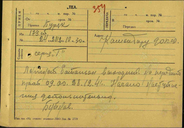 Телеграмма: «Лыжный батальон выходит на передний край 09.00 28.12.41. Начало наступления дополнительно. Подпись – Буйдов». В этом документе описывается период с 28.12.1941 по 28.12.1941 г.41
