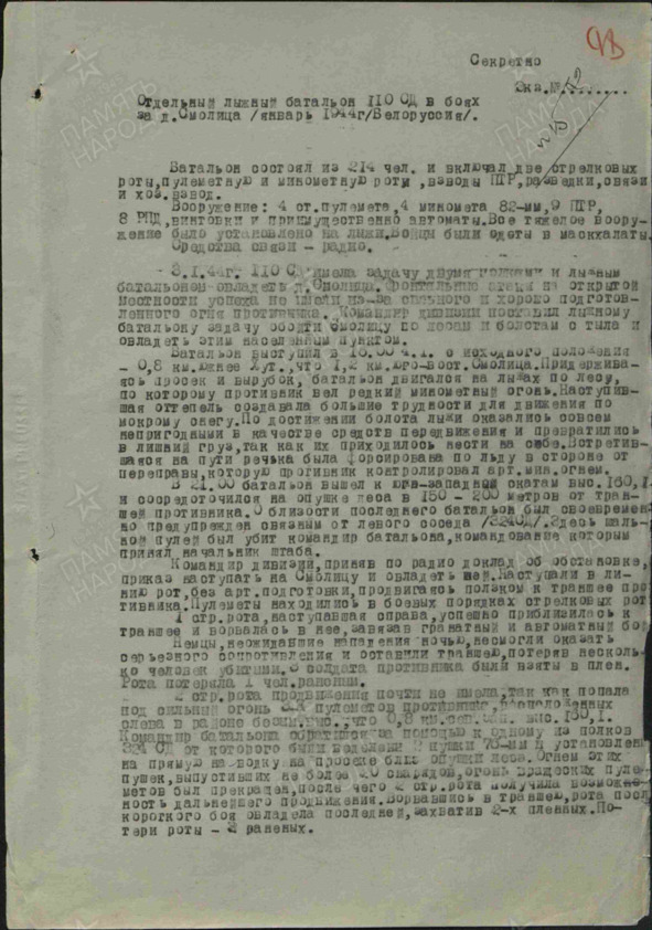 Отдельный лыжный батальон 110 ОД в боях за д. Смолица,