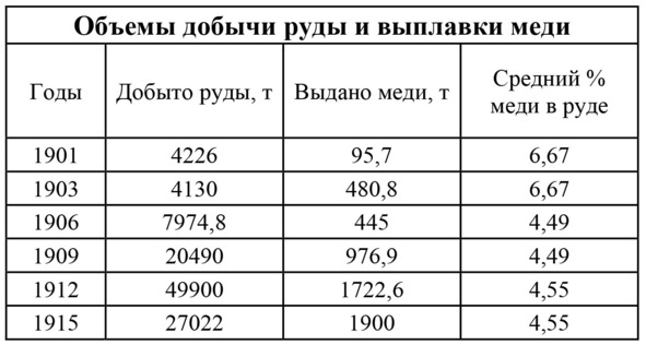 Из года в год росли объемы добычи руды и выплавки меди. (См. таблицу).