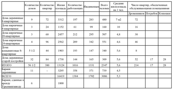 В конце 1934 года был произведен переучет жилья в поселке. По данным на 1 декабря, было 56 домов на 380 квартир, в которых проживало 2347 человек, и 11 бараков, где было заселено 739 человек. Причем во время переучета зафиксированы недоделки в новых домах и составлен перечень ремонтных работ.