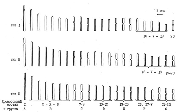 Процессы дифференцировки родоначальных кроветворных клеток в костном мозге, как известно, осуществляются при влиянии различных гормонов и других уровней регуляции с учетом потребностей организма (Моничев А. Н., 1984; Гаврилов О. К., Фанштейн Ф. Э., Турбина Н. С., 1987). В культуре крови отсутствуют сложные уровни регуляции, имеющиеся в организме, поэтому там образуется один тип хромосомных наборов – тип II. В костном мозге, где происходит кроветворение и дифференцировка клеток в разных направлениях при одном и том же генном наборе, что и в культуре крови, образуются три типа хромосомных наборов.