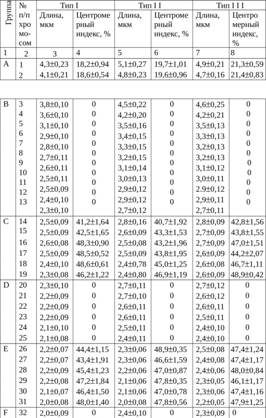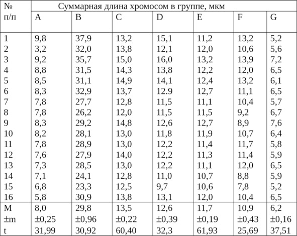 Наименьшую вариабельность по суммарной длине наблюдали у метацентрических хромосом групп С, Е и G, у которых был наибольший критерий достоверности (t): 60,4; 61,9 и 37,5.