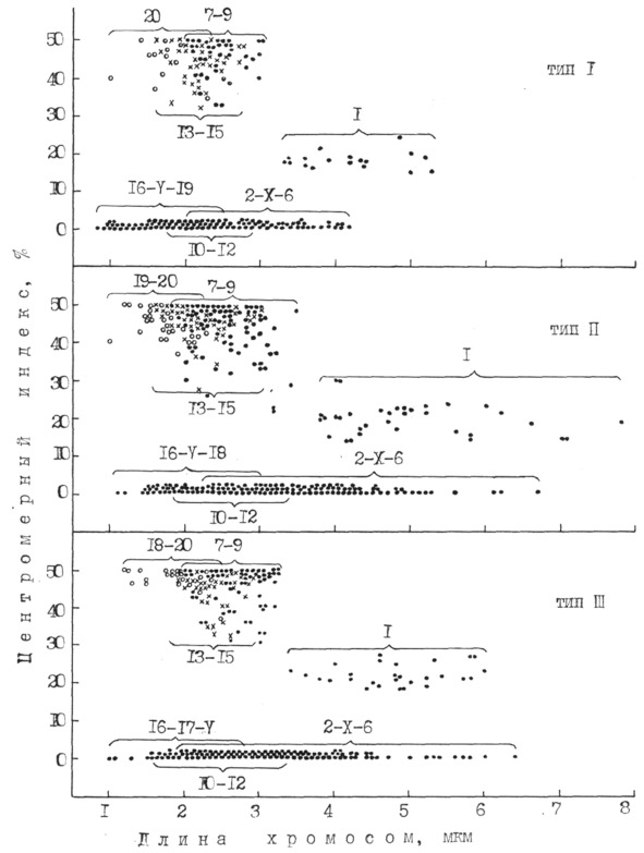 Таким образом, классификация хромосомных наборов из костного мозга с учетом их линейных параметров и морфоструктуры позволила выделить три типа хромосомных наборов, различающихся количеством акроцентрических и метацентрических хромосом.