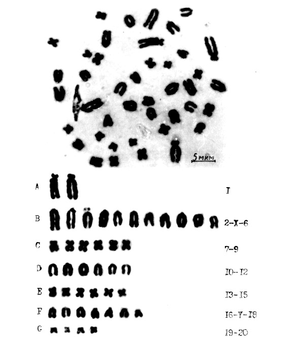 На равномерно окрашенных хромосомных наборах из костного мозга четко прослеживается различие по числу акроцентрических и метацентрических морфоструктур, но гомологичные пары достоверно идентифицировать можно лишь некоторые.