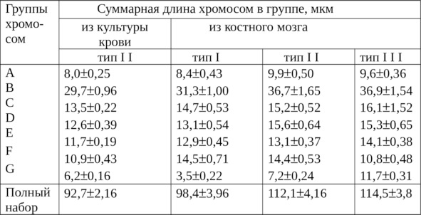 Сопоставление линейных параметров из культуры клеток и костного мозга показано в таблице 4. Если в костном мозге длина всех хромосом в наборе была наименьшей в типе I – 98,4±3,96 мкм и наибольшей в типе III – 114,5±3,78 мкм, то в клетках из культуры крови она составила лишь 92,7±2,16 мкм. Это было значительно меньше суммарной длины хромосом типа II из костного мозга, где равнялась 112,1±4,16 мкм.