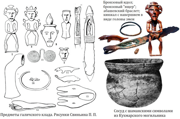 Другой уникальной находкой сделанной крестьянами в 1836м году в окрестностях села Туровское, близ города Галича в Костромской области, является так называемый галичский клад – комплекс предметов древнего шамана, имеющих ритуально-культовое назначение, возможно он сопровождал захоронение шамана или его кенотаф (имитация захоронения без самого покойника). Предметы имеют абашевское (браслеты, очковидные подвески) и сейминско-турбинское (ножи с зооморфной рукоятью) происхождение.