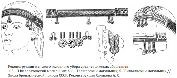 Одним из ярких и характерных признаков средневолжских абашевцев являются украшения головного убора. В женских погребениях сохранились остатки кожаных венчиков с нашитыми мелкими медными бляшками, пронизями и бисером. В районе лба и висков спускались подвески в виде лепестковых бляшек-розеток. Сзади к венчикам крепились «косники» из шнура с нанизанными медными пронизями и очковидными подвесками на конце. В одном из погребений к кожаной основе были пришиты три кожаные ленты различной длины – одна спускалась от правого виска до плеча, вторая – от левого виска до локтя, третья – от левого виска до колен. Полосы состояли из лепестковых розеток, горизонтально расположенных пронизок, полусферических бляшек и спиралей в виде волны.