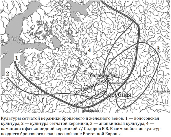 Характерным признаком этих племён является керамика с сетчатым (псевдосетчатым, текстильным, ниточно-рябчатым) отпечатком, который означает, что для изготовления этих горшков использовалась ткань. Такая технология не имеет параллелей в предшествующих культурах эпохи бронзы, но имеет схожие элементы в культуре неолита1, это свидетельствует о ее местном субстрате. Одинаковая техника изготовления горшков племенами, расселившимися на обширных территориях, говорит об их культурном единстве, о генетическом родстве. Именно на этой базе в XII – VI вв. до н. э. происходило формирование этнических основ более поздних финноязычных народов.