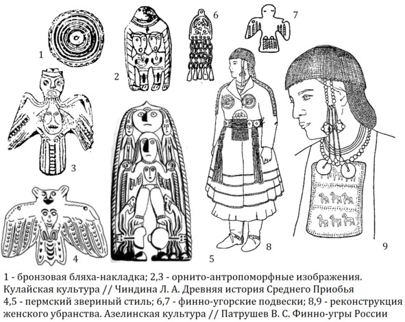 Символизм финно-угорского мира нашел отражение в ярких женских украшениях, стиль которых начал формироваться на заре протофинских археологических культур, но окончательно приобрел свои уникальные отличительные особенности только во II – III вв. н. э. В это время, под натиском гуннских племён, из Западной Сибири на территорию финского мира приходят угорские и самодийские племена – представители кулайской археологической общности, в результате их взаимодействия с ананьинцами, в таёжном Прикамье возникает гляденовская культура, южнее, в Волго-Вятском междуречье формируется азелинская культура, именно в это время, в этих местах смешиваются символы финского и угорского миров, что находит отражение в пермском зверином стиле, а женский облик приобретает свой неповторимый звон бронзовых шумящих украшений.