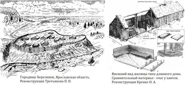 Древнейший тип жилища – округлая полуземлянка с конической крышей. В V – II вв. до н.э. происходит быстрый рост населения, появляются первые крупные городища, жилища становятся длинными и разделяются перегородками на отапливаемые комнаты с очагами внутри и узкие холодные тамбуры. В более поздний период, на рубеже эр, появляются квадратные в плане небольшие бревенчатые постройки на опорных столбах с земляными полами и печами-каменками.