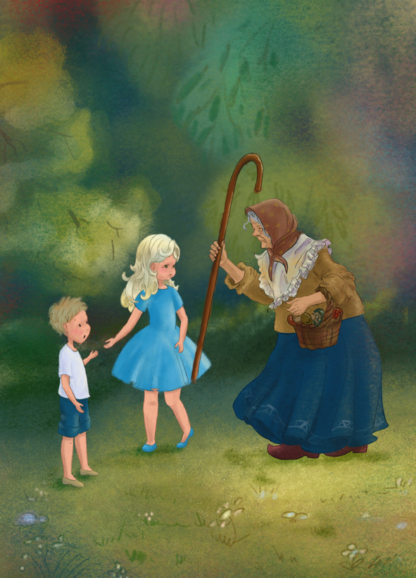 И вдруг на пути им встретилась бабушка с лукошком, она несла грибы да ягоды, видно было, что корзинка была тяжёлой.