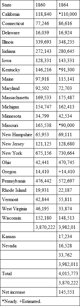 The election has exhibited another tact not less valuable to be known – the fact that we do not approach exhaustion in the most important branch of national resources, that of living men. While it is melancholy to reflect that the war has filled so many graves and carried mourning to so many hearts, it is some relief to know that, compared with the surviving, the fallen have been so few. While corps and divisions and brigades and regiments have formed and fought and dwindled and gone out of existence, a great majority of the men who composed them are still living. The same is true of the naval service. The election returns prove this. So many voters could not else be found. The States regularly holding elections, both now and four years ago, to wit, California, Connecticut, Delaware, Illinois, Indiana, Iowa, Kentucky, Maine, Maryland, Massachusetts, Michigan, Minnesota, Missouri, New Hampshire, New Jersey, New York, Ohio, Oregon, Pennsylvania, Rhode Island, Vermont, West Virginia, and Wisconsin, east 3,982,011 votes now, against 3,870,222 cast then, showing an aggregate now of 3,982,011. To this is to be added 33,762 cast now in the new States of Kansas and Nevada, which States did not vote in 1860, thus swelling the aggregate to 4,015,773 and the net increase during the three years and a half of war to 145,551. A table is appended showing particulars. To this again should be added the number of all soldiers in the field from Massachusetts, Rhode Island, New Jersey, Delaware, Indiana, Illinois, and California, who by the laws of those States could not vote away from their homes, and which number can not be less than 90,000. Nor yet is this all. The number in organized Territories is triple now what it was four years ago, while thousands, white and black, join us as the national arms press back the insurgent lines. So much is shown, affirmatively and negatively, by the election. It is not material to inquire how the increase has been produced or to show that it would have been greater but for the war, which is probably true. The important fact remains demonstrated that we have more men now than we had when the war began; that we are not exhausted nor in process of exhaustion; that we are gaining strength and may if need be maintain the contest indefinitely. This as to men. Material resources are now more complete and abundant than ever.