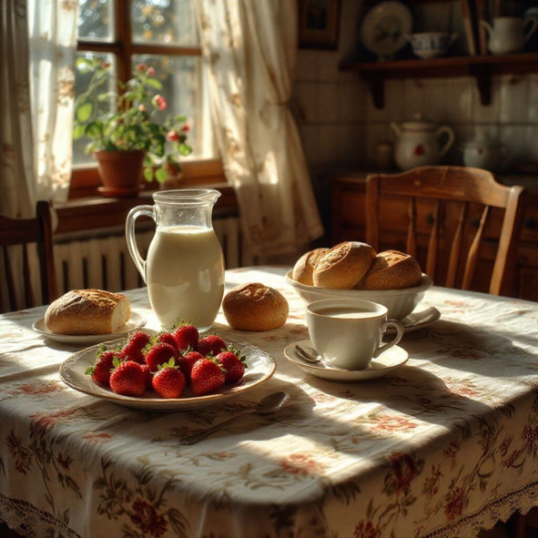 Она спустилась в кухню босиком, ступни тонули в прохладе выскобленных до блеска половиц. Бабушка Рая уже создавала волшебство у печи. В огромном глиняном кувшине, покрытом каплями росы, словно слезами ночи, стояло парное молоко. Оно было не белым, а скорее кремово-золотистым, густым, как жидкий шелк, и по его поверхности плавали жирные, янтарные сливки-островки. Запах был божественным – теплый, живой, чистый. Рядом, на деревянной доске, дымился только что вынутый из печи каравай хлеба. Корочка его была темно-золотой, пузыристой, хрустящей на вид, а снизу доносился теплый, дрожжевой, невероятно уютный дух. Он пах солнцем и жаром доброй и старой печи.