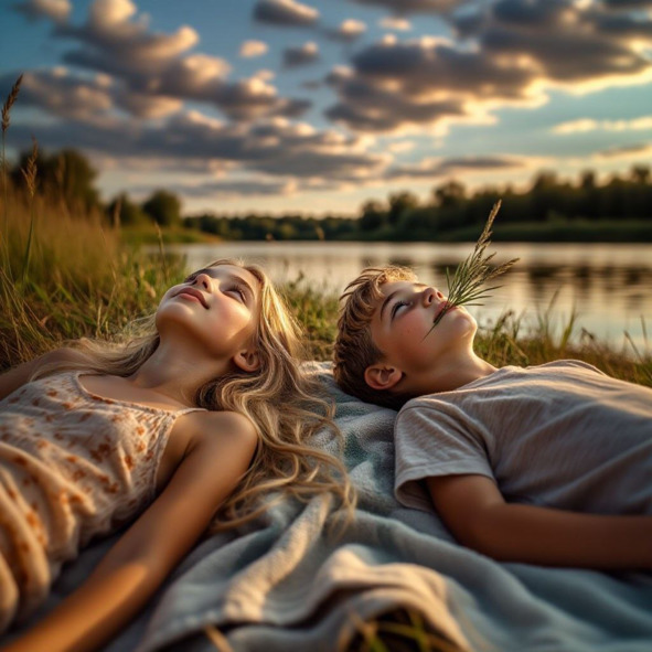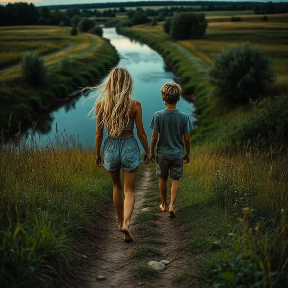 Солнце висело в зените, белое и неумолимое. Воздух над полем дрожал марево, стрекот кузнечиков сливался в сплошной, звенящий гул. Бабушкин дом дремал в тени лип, но Элли и Вовка были далеки от сна. Они стояли на краю тропинки, ведущей вниз, к синей слегка вьющейся реки, босые и готовые к прыжку.