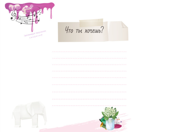 Вот видишь, это не будет Анкета друзей с дедлайном к отправке в семь дней, – это будет твоя очень личная шкатулка желаний и откровений длинною в год. Поверь мне, что читать себя не менее интересно, чем своих подруг, а открывать себя – захватывающе увлекательное занятие. Думаю, что попадись тебе в руки сейчас Анкета друзей из пятого класса, ты бы в первую очередь прочитала не мои, а свои откровения! Я бы поступила именно так.