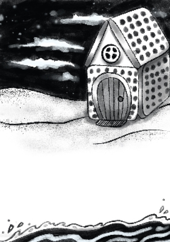 Мальчик живет совсем один, ведь на пляже никого нет кроме бесконечного, унылого, надоедливого песка. Песок часто забивается в ботинки, а в жару по нему больно идти. Вафельный дом не очень прочный, поэтому мальчик очень много трудится, чтоб тот не разваливался.