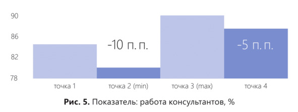 Теперь посмотрим на рис. 5. Здесь в разрезе тех же торговых точек измерены конкретные показатели, которые непосредственно влияют на уровень клиентского обслуживания. Мы видим, что показатель работы консультантов по торговой точке 4 занимает второе место и отстает от лидера всего на 5%. Что же получается? Основываясь на средних величинах уровня клиентского обслуживания, руководство компании объявило взыскание персоналу, который хорошо работает?! Неудивительно, если после подобных действий этот хорошо работающий персонал уйдет из компании.
